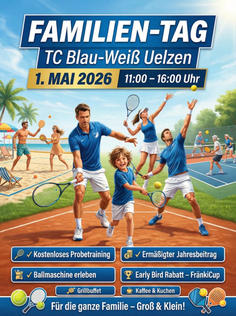 Am Donnerstag, den 01. Mai 2025 laden wir alle Mitglieder, Freunde des Vereins und tennisbegeisterte Familien herzlich zum großen Familientag auf unsere Vereinsanlage in Oldenstadt, Zum See 29, ein.